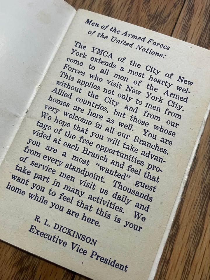 Shop › Wartime Servicemen’s Guide book (New York) “Hang your Hat at the YMCA” Image 1 of 10 Image 2 of 10 Image 3 of 10 Image 4 of 10 Image 5 of 10 Image 6 of 10 Image 7 of 10 Image 8 of 10 Image 9 of 10 Image 10 of 10 Wartime Servicemen’s Guide book (New York) “Hang your Hat at the YMCA” £10.00 Wartime Servicemen’s Guide book (New York) “Hang your Hat at the YMCA” Add To Cart Added! Wartime Servicemen’s Guide book (New York) “Hang your Hat at the YMCA”